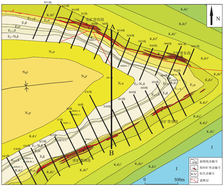 烏拉根礦區(qū)位于庫什維克復(fù)式向斜的東段,烏拉根隆起的北側(cè),受控于烏拉根向斜,該向斜的軸向近東西向,向東翹起。礦區(qū)出露地層主要為長城系阿克蘇群(ChAk);下白堊統(tǒng)克孜勒蘇群(K1Kz);古近系阿爾塔什組(E1a)、齊姆根組(E1-2q)、卡拉塔爾組(E2k)、烏拉根組(E2w)、巴什布拉克組(E2-3b);漸新-中新統(tǒng)克孜洛依組(E3-N1k);中新統(tǒng)安居安組(N1a)、帕卡布拉克組(N1p)等。向斜核部為N1p,南、北翼對應(yīng)出現(xiàn)N1a、E3-N1k、E2-3b、E2w、E2k、E1-2q、E1a、K1Kz。礦區(qū)重要的斷裂為吾合沙魯斷裂,其重要的影響是它穿越烏拉根鉛鋅礦的北礦帶,所形成的破碎帶中形成較富的透鏡狀方鉛礦體。同時在烏拉根向斜的南北兩翼均存在小規(guī)模的正斷層及不同規(guī)模的節(jié)理構(gòu)造,這些小規(guī)模的正斷層、南北向及北西向和北東向具有張性性質(zhì)的節(jié)理發(fā)育區(qū)是地表乃至地下鉛鋅礦體集中分布的區(qū)域(圖2)。