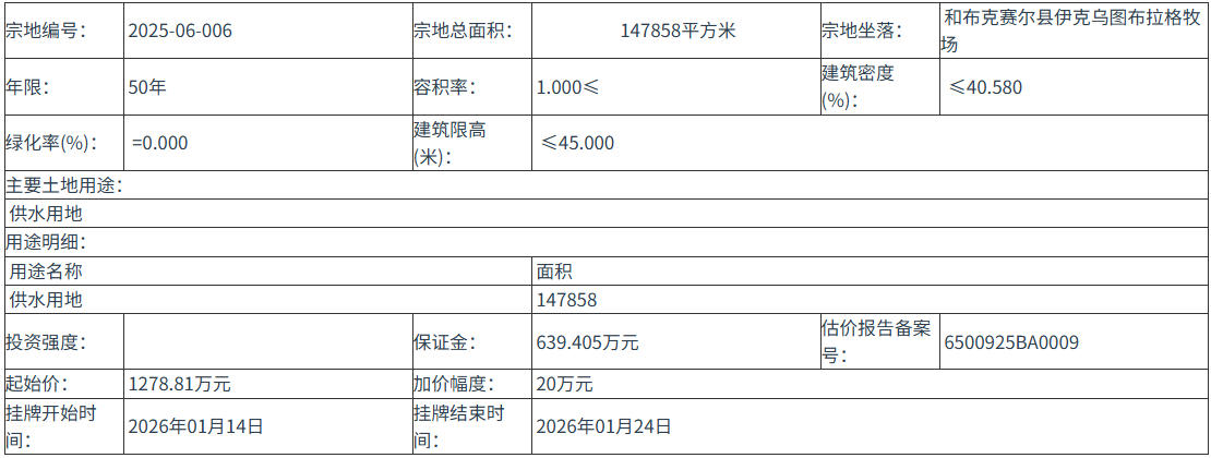 四、 本次掛牌出讓的詳細資料和具體要求,見掛牌出讓文件。申請人可于 2025年12月23日 至 2026年01月13日 到 和布克賽爾縣自然資源局 獲取 掛牌出讓 文件。