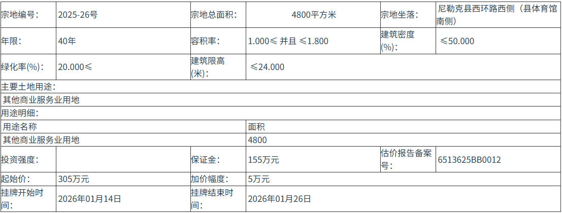 2025-26號(hào) 號(hào)地塊:2026年01月14日 10時(shí)00分 至 2026年01月26日 18時(shí)00分;