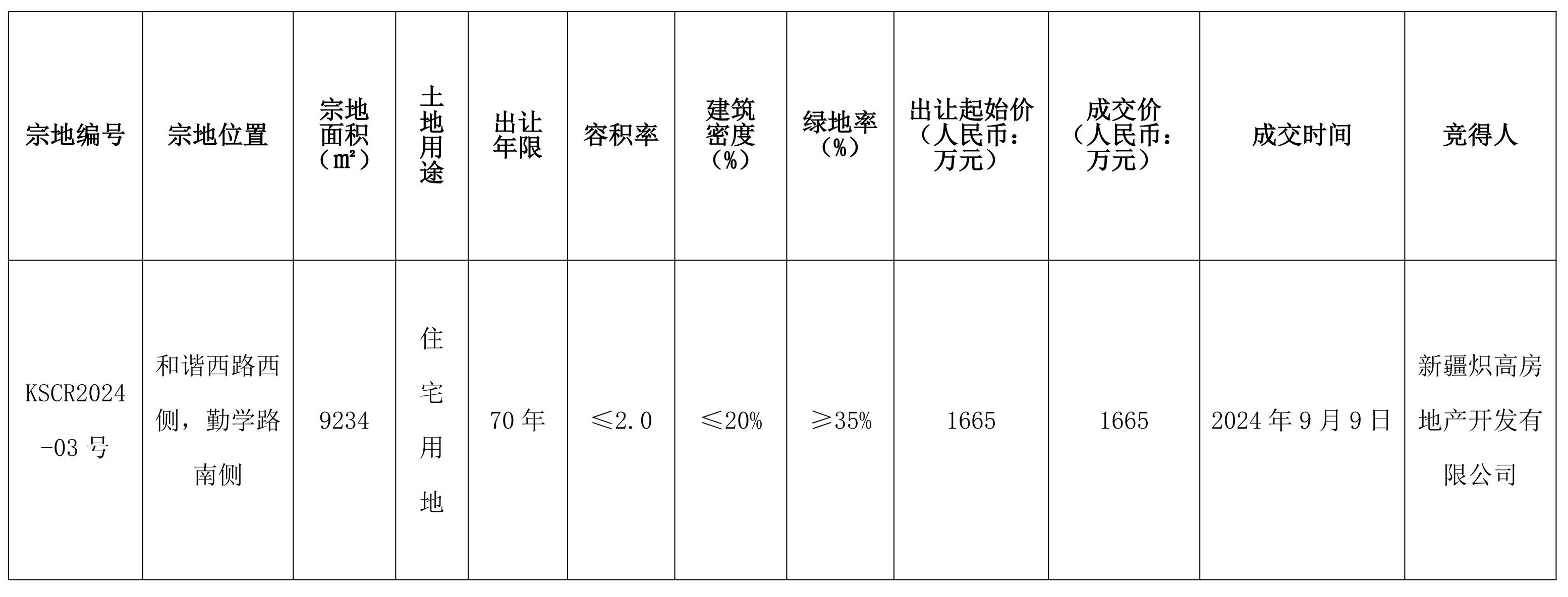 根據《中華人民共和國土地管理法》《招標拍賣掛牌出讓國有建設用地使用權規定》(國土資源部令第39號)《自治區深化公共資源交易平臺整合共享工作方案〉的通知》(新政辦函〔2019〕250號)等有關法律法規及文件的規定,喀什市自然資源局以掛牌方式出讓1(幅)地塊的國有建設用地使用權,現將出讓成交結果公示如下: