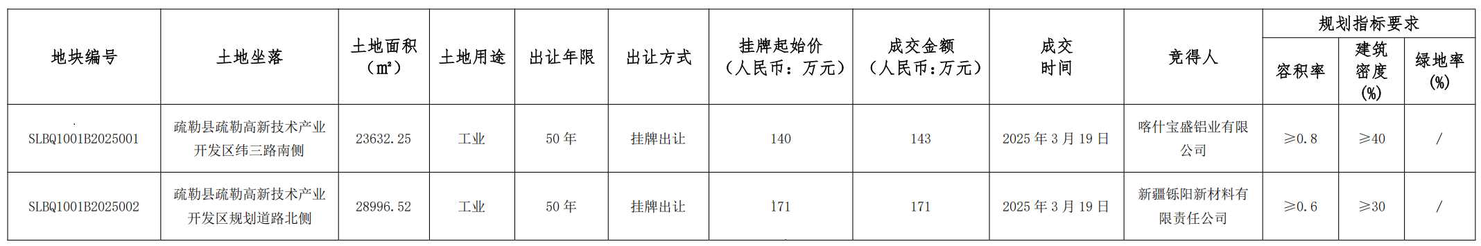 根據《中華人民共和國土地管理法》《招標拍賣掛牌出讓國有建設用地使用權規定》(國土資源部令第39號)、《自治區深化公共資源交易平臺整合共享工作方案〉的通知》(新政辦函〔2019〕250號)等有關法律法規及文件的規定,疏勒縣自然資源局以掛牌方式出讓2(幅)地塊的國有建設用地使用權,現將出讓成交結果公示如下:
