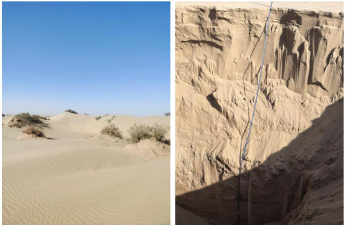 5.礦體特征:該建筑用砂(風積砂)礦體形態呈四邊形,南北方向寬0.6千米,東西方向長1.2千米,出露標高1049-1034米,普查區范圍面積為0.6149平方千米。礦體向四周均延伸至普查區外,根據普查區內淺井揭露,淺井控制深度1.8~6米,平均深度3.89米;圈定礦體厚度0~3.9米,平均厚度1.8米。礦體直接出露地表,主要為土黃色細砂土,粒度較細,0.075~0.3mm,成分主要為石英、長石及云母,分選較好。